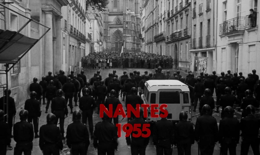 หนังเริ่มต้นด้วยภาพขาว-ดำ (บรรยากาศของฟีล์มเก่า, ภาพความทรงจำ) แต่ขี้นตัวอักษร Nantes 1955 ด้วยสีแดงเลือด (เพื่อเป็นการเน้นย้ำให้มีความโดดเด่นชัดขี้นมา) นำเสนอการเตรียมเผชิญหน้าระหว่างตำรวจ vs. ผู้ชุมนุมประท้วง อีกไม่นานจะเกิดการปะทะต่อสู้ มีผู้บาดเจ็บ ล้มตาย กลายเป็นโศกนาฎกรรม