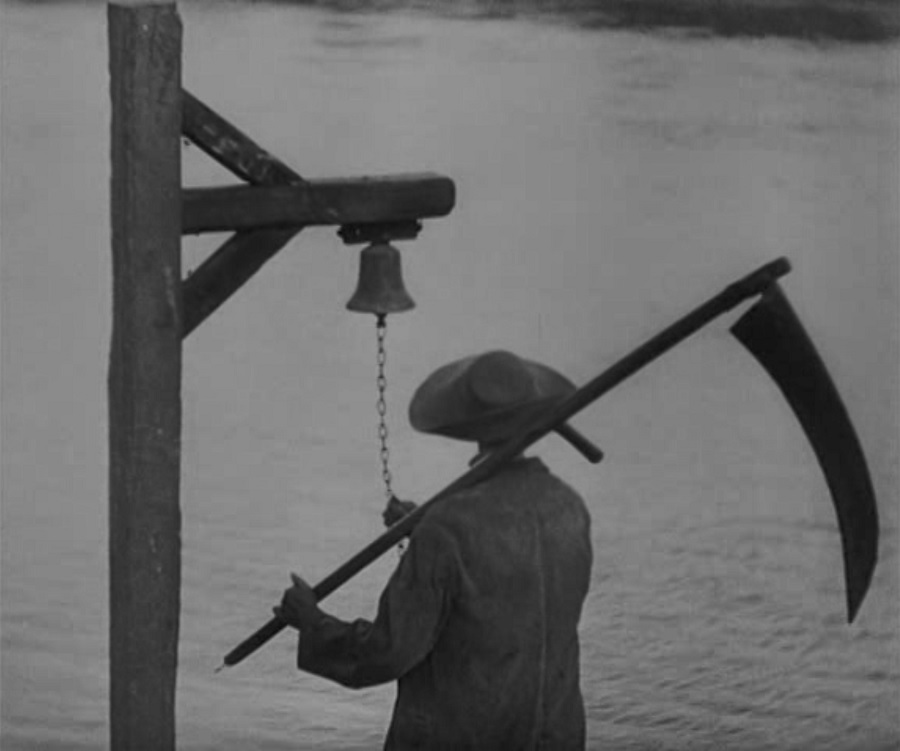 ช็อตแรกๆของหนังที่มีความตราตรึงอย่างมาก ชายถือเคียว (คล้ายยมทูต) สัญลักษณ์การนำทางสู่ความตาย กำลังเคาะระฆังเรียกเรือ, แม่น้ำไหลเชี่ยวแทนด้วยชีวิต, เรือข้ามฟาก ฝั่งหนึ่งคือโลกมนุษย์ อีกฝั่งคือโลกแห่งความตาย และเมื่อข้ามแล้ว โดยปกติจะไม่สามารถหวนคืนกลับอีกฝั่งได้