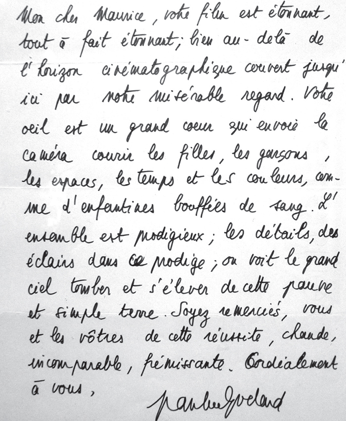 My dear Maurice, your film is astonishing, totally astonishing; far beyond the cinematographic horizon covered up until now by our wretched gaze. Your eye is a great heart that sends the camera hurtling among girls, boys, spaces, moments in time, and colors, like childish tantrums. The ensemble is miraculous; the details, sparks of light within this miracle; we see the big sky fall and rise from this poor and simple earth. All of my thanks, to you and yours, for this success – warm, incomparable, quivering. Cordially yours,