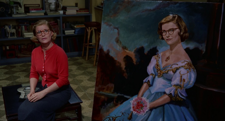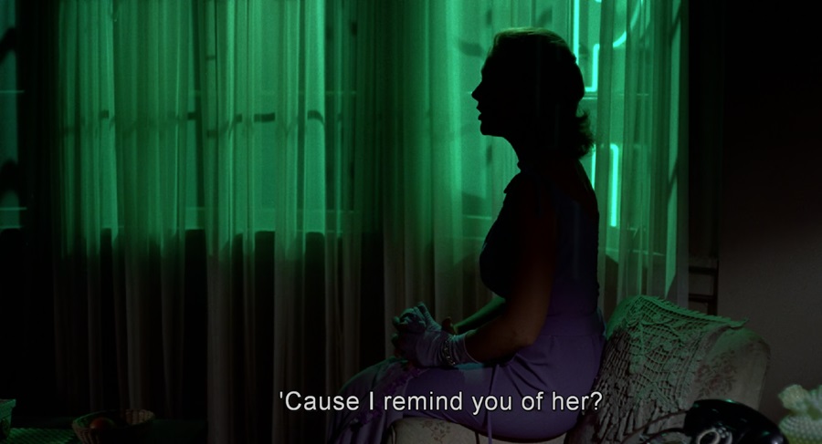 พอกลายมาเป็น Judy แม้สวมใส่เสื้อผ้าสบายๆ (เห็นว่า Novak ไม่ได้สวมใส่ยกทรงด้วยนะ) แต่จิตใจกลับเต็มไปด้วยความร้อนรน กระวนกระวาย กลัวจะถูกจับได้ จึงพยายามต่อต้านขัดขืน ไม่ยินยอมให้ Scottie เปลี่ยนแปลงตนเองเป็น Madeleine ถึงอย่างนั้นกลับมิอาจฝืนใจตนเอง เพราะรักจึงยอมทุกอย่าง สุดท้ายเธอจึงสูญเสียทุกสิ่งอย่าง
