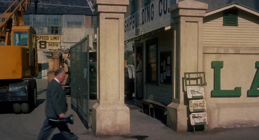 ผกก. Hitchcock ถือกระเป๋าใส่เครื่องดนตรีอะไรสักอย่าง (บ้างว่า Trumpet, บ้างว่า Bugle, บ้างว่า Foghorn) เดินจากซ้ายไปขวา ผ่านหน้าท่าเรือ Elster’s shipyard นี่ถือเป็น Establishing Shot นำเข้าสู่การพบเจอระหว่าง Scottie กับเพื่อนสมัยเรียน Gavin Elster