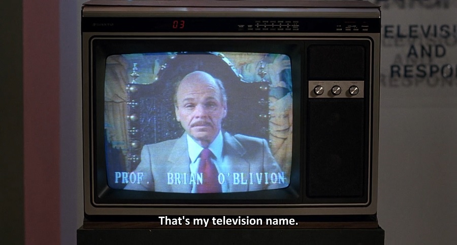 ภาพยนตร์ของผู้กำกับ Cronenberg แทบทุกเรื่องจะต้องมีตัวละครที่เป็นศาสตราจารย์ ผู้เชี่ยวชาญแขนงต่างๆ สำหรับพูดอธิบายเหตุผล ที่มาที่ไป (ทางวิชาการ) มันเกิดเหตุการณ์ห่าเหวอะไรขึ้น สำหรับ Videodrome (1983) ก็คือตัวละคร Dr. Brian O’Blivion แค่นามสกุลก็บอกใบ้อะไรหลายๆ (Oblivion คือสภาพการสูญเสียสติ ไม่รับรู้ตัวเองว่ากำลังทำอะไร เกิดเหตุการณ์อะไรขึ้นก่อนหน้า)