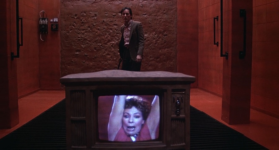 ขณะเดียวกันบุคคลที่อยู่ในจอโทรทัศน์ นี่เช่นกันคือความสับสน เลือนลางในจินตนาการของ Max Renn ใคร่อยากครอบครองสาวสวย Nicki Brand แต่กลับได้หญิงชรา Masha ตื่นขึ้นมาถูกมัดมือมัดเท้านอนอยู่บนเตียง … แต่ทั้งหมดนี้ก็แค่ภาพหลอน เพียงเพ้อฝันไป (ในห้องที่เต็มไปด้วยเงาบานเกล็ด สื่อถึงการถูกคุมขังอยู่ในจินตนาการเพ้อฝัน)