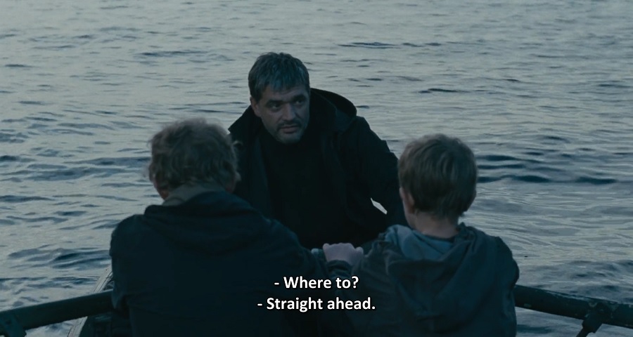 สองเด็กชายพยายามลากศพบิดา พาขึ้นเรือ หวนกลับไปอีกฟากฝั่ง คาดว่าคงต้องการพากลับบ้าน สังเกตว่าหลายๆช็อตถ่ายติดทิวทัศน์ธรรมชาติกว้างใหญ่ (ขนาดต้นหญ้าริมชายหาด ยังดูสูงใหญ่กว่าเด็กๆเสียอีก!) มอบสัมผัสกระจิดริด กระจ่อยร่อย มนุษย์แค่เพียงสิ่งมีชีวิตเล็กๆในโลกอันกว้างใหญ่ เวิ้งว้างห่างไกล ซึ่งก็สะท้อนอารมณ์ ความรู้สึก สภาพจิตใจพวกเขาได้ด้วยเช่นกัน