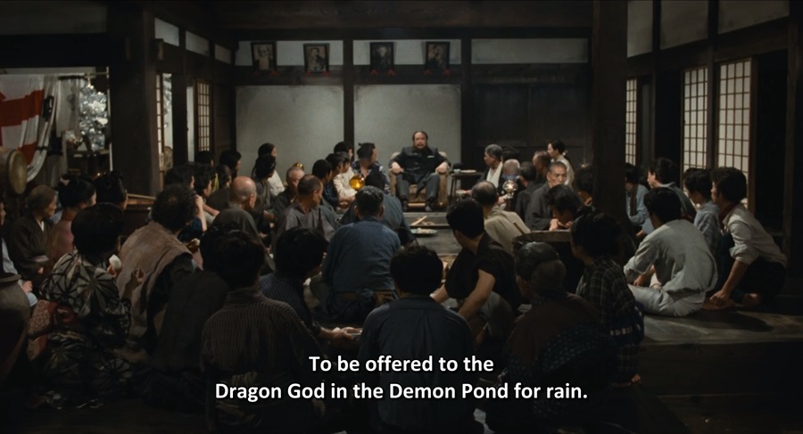 Yamasawa บังเกิดความอิจฉาริษยา Hagiwara ที่ได้เมียสวย จึงพยายามโน้มน้าวเกลี้ยกล่อมให้ทอดทิ้งเธอ เดินทางกลับกรุง Tokyo ด้วยกัน! แต่เขาก็พูดเล่าเบื้องหลัง ตำนานเทพเจ้ามังกรอาศัยอยู่ใต้สระน้ำ Demon Pond และหน้าที่ที่เจ้าตัวตัดสินใจสืบทอดต่อจากผู้ดูแลก่อน ต้องเคาะระฆังที่ตั้งอยู่ข้างบ้านวันละสามเวลา เพื่อไม่ให้เทพเจ้ามังกรทอดทิ้งคำสัญญาว่าจะปกป้องหมู่บ้านจากภัยพิบัติทางธรรมชาติ