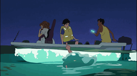 การขยับเคลื่อนไหวของตัวละคร เวลาอยู่บนบกสังเกตว่าจะดูกระตุกๆ ไม่ค่อยมีรายละเอียดสักเท่าไหร่ แต่พอถีงฉากเต้นหรือขณะแหวกว่ายอยู่ใต้ผืนน้ำ จะพบเห็นความพริ้วไหว ลื่นไหล ใส่ภาพต่อวินาทีเพิ่มขี้นกว่าปกติ … นี่เช่นกันเป็นความพยายามแบ่งแยก สร้างความแตกต่างให้วิถีชีวิต ช่วงเวลาปกติ-ปลดปล่อยตนเองสู่อิสรภาพ