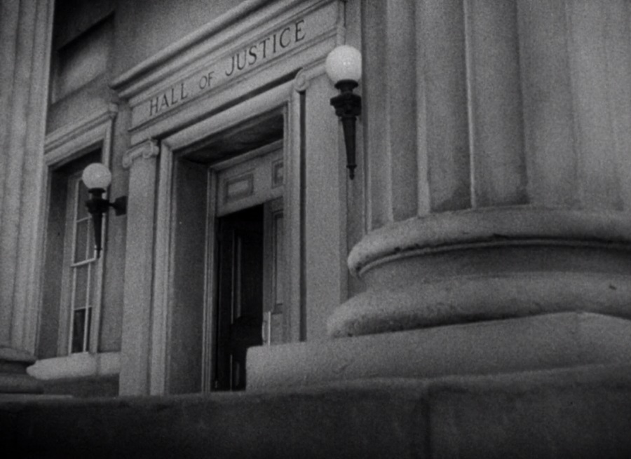 ภาพแรกของหนัง ฉายประตูทางเข้า Hall of Justice (ศาลยุติธรรม?) แต่แทนที่จะถ่ายภาพสถานที่จริง กลับเป็นฉากสร้างขึ้นในสตูดิโอ ราวกับจะสื่อถึงการไม่มีอยู่จริง? และอีกสิ่งน่าสนใจก็คือถ่ายมุมเงย (มักสื่อถึงอำนาจบาดใหญ่) หันกล้องเอียงๆ มันช่างดูบิดๆเบี้ยวๆ (กลิ่นอาย German Expressionism)